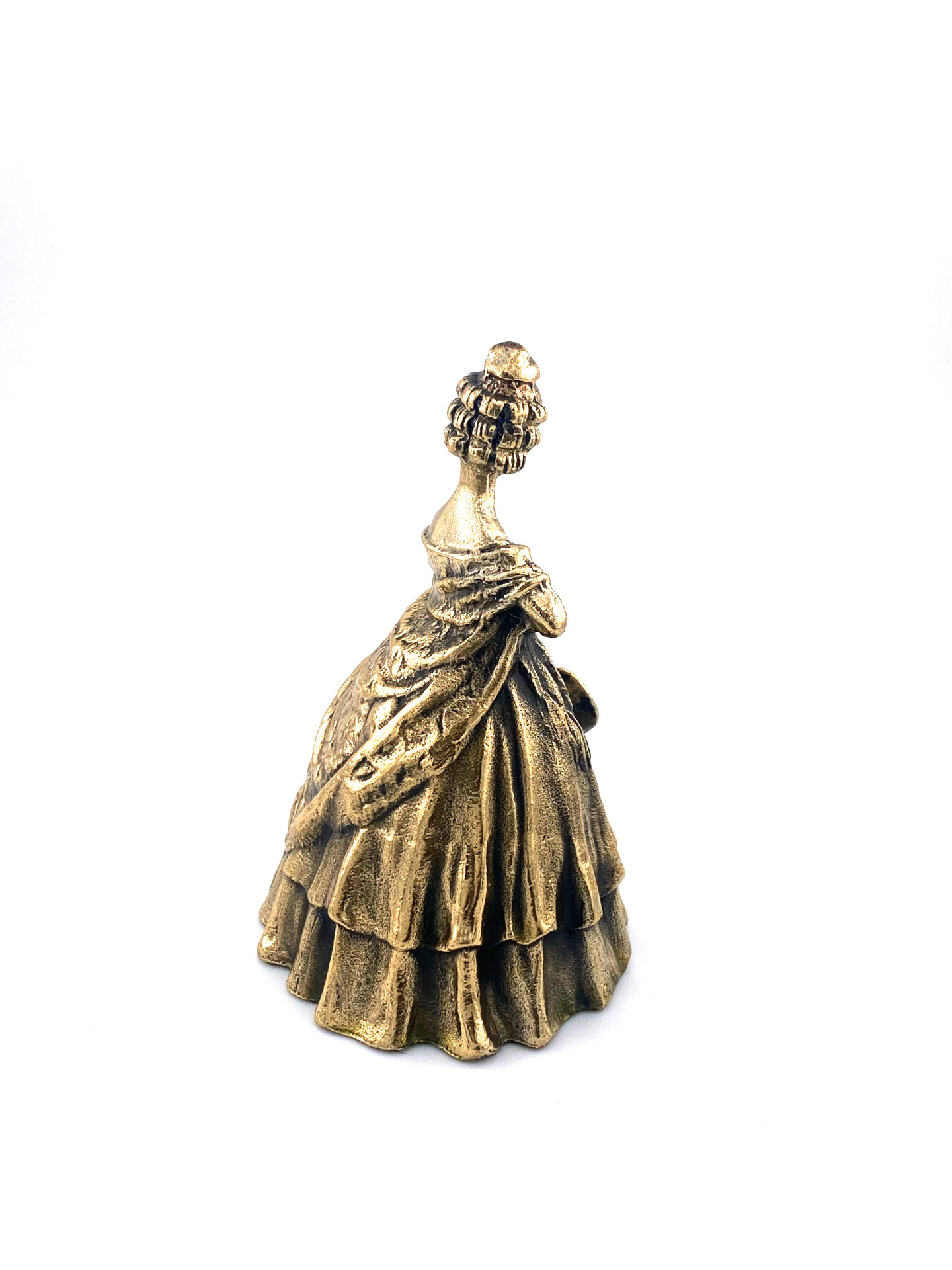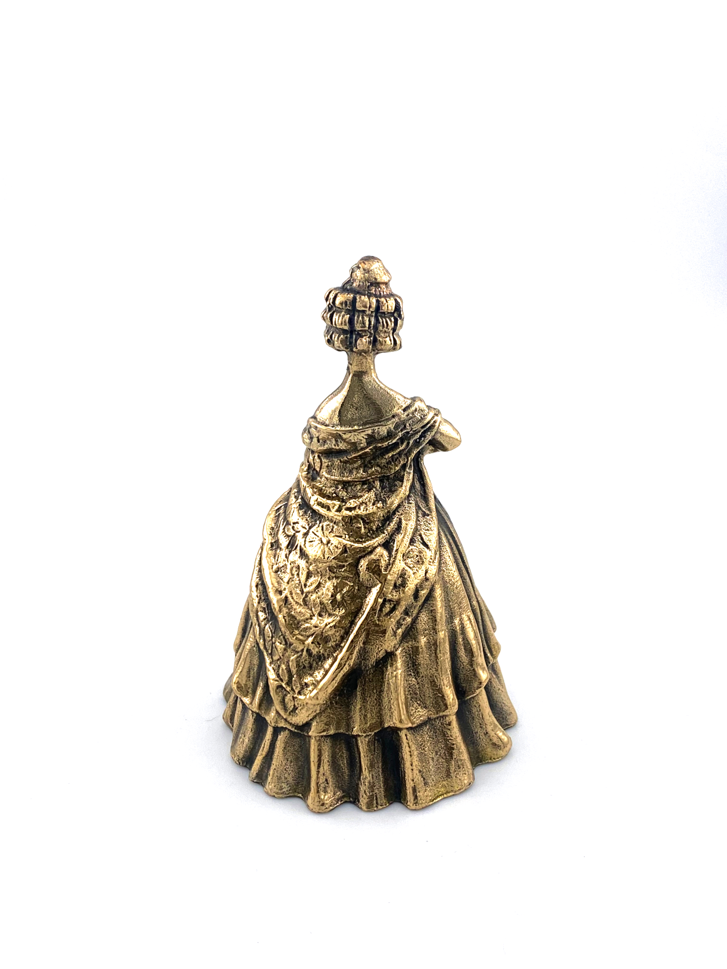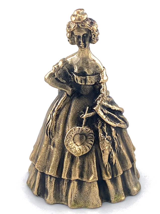 Diese exquisite Messingglocke zeigt eine detailgetreue Damenfigur in einem Vintage-Kleid, die die Eleganz und Anmut einer vergangenen Epoche einfängt. Die 65 mm große Glocke ist wunderschön gearbeitet. Die Figur hält ein herzförmiges Ornament, das dem Design Charme und Persönlichkeit verleiht. Diese Glocke ist perfekt für Sammler oder als einzigartiges Dekorationsstück geeignet. Sie vereint Funktion und Kunstfertigkeit.